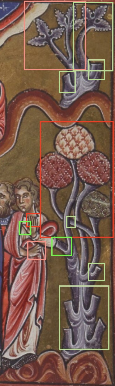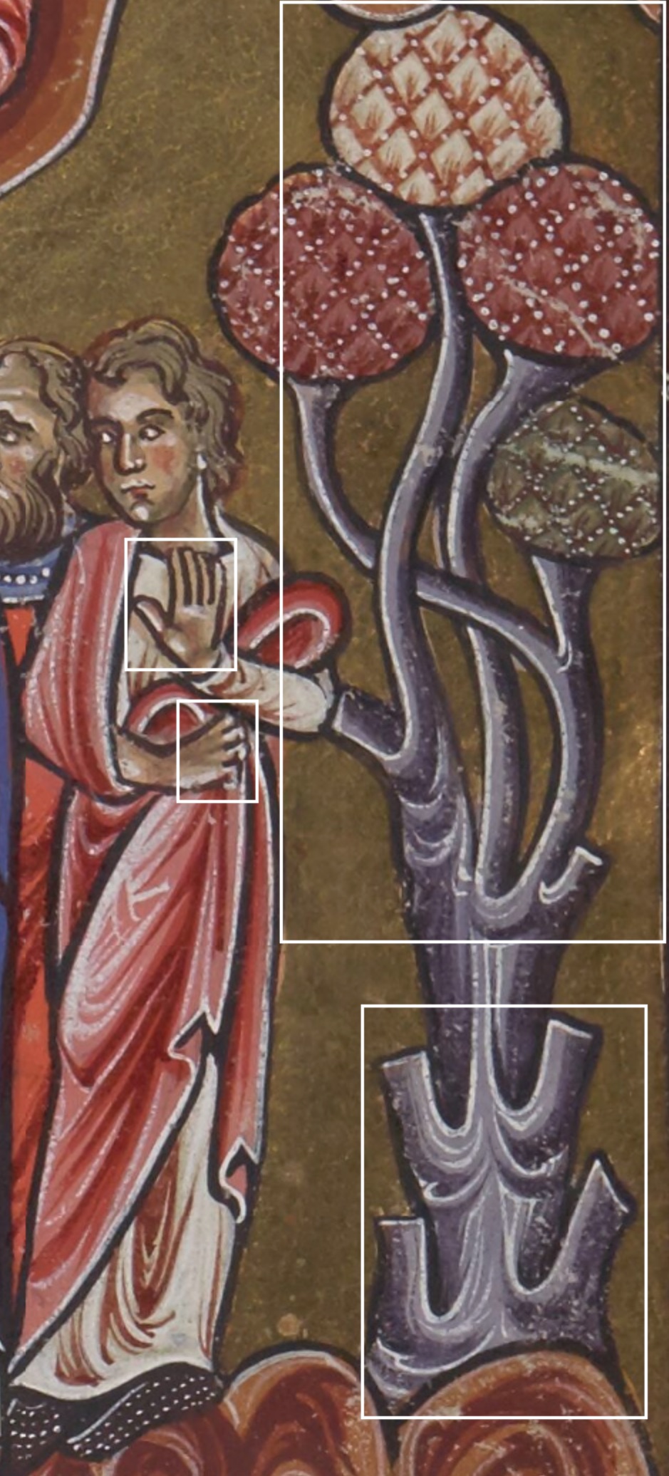 Just to show what I mean, I enclose two specimens: a miniature of ca. 990 which shows the inception of the process, viz., the gradual hardening of the pine into a mushroom-like shape, and a glass painting of the thirteenth century, that is to say about a century later than your fresco, which shows an even more emphatic schematization of the mushroom-like crown.