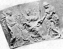 “Purified, the initiate is prepared to approach the goddess. In the final scene on the urn, Heracles approaches Demeter who is seated on the kiste, the basket [chest, box, trunk] holding the sacred ritual objects of the Greater Mysteries–