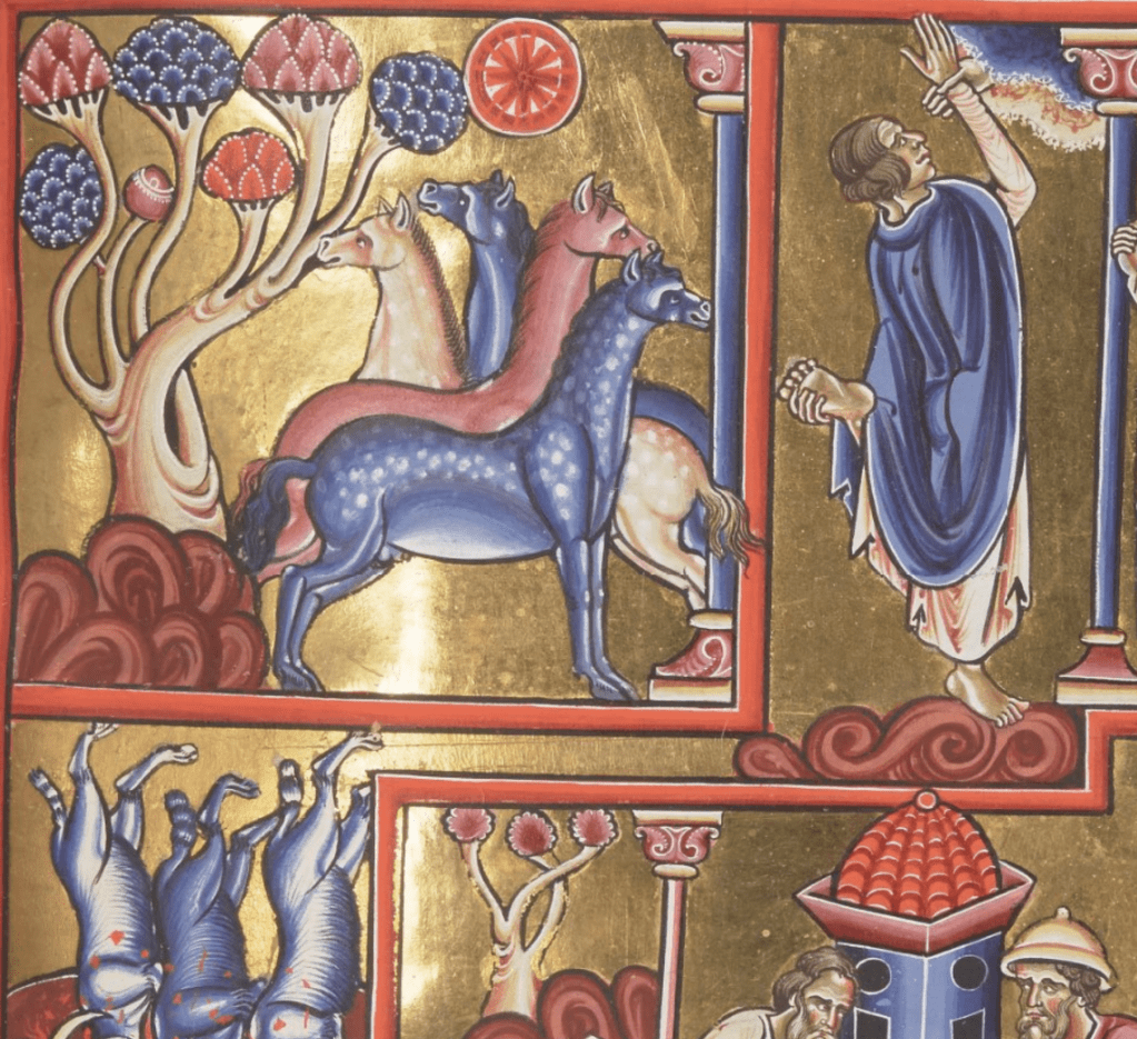 Eadwine Horses Looking Smiling at Non-Branching Cap and God Holding Up Guy by Right Hand