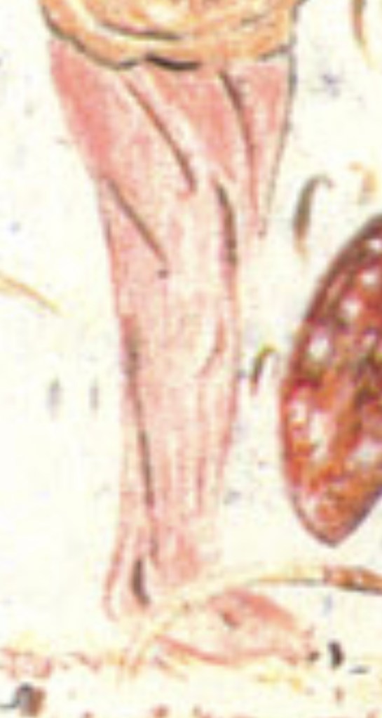 this is to be read as “the right leg of the mushroom tree is near Eve’s legs which carry the message of non-branching”.