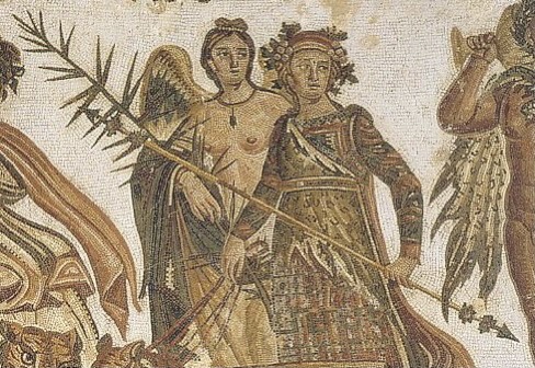 the ego death community contributed the Dionysus mosaic with ariadne holding a branch, right next to an exact parallel with in an exact parallel with Dionysus Dionysus holding a double tipped spear nonbranching