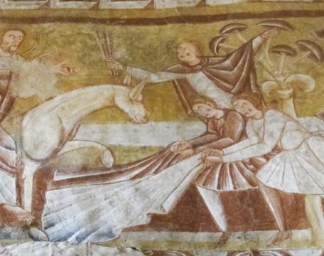 Jesus’ right foot touching donkey’s right foot on ground, left lifted.