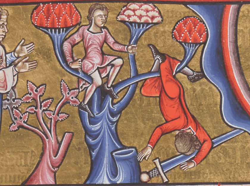 - Lifted garment above non-branching tree 2x. [discovered 10:11 p.m. Sunday, February 12, 2023] – experienced as a nice reward at end of weekend of working on the psalter gallery/analysis. Confirmed by virtue of the all-too-familiar feeling “How was I so blind as to not immediately see/notice this?”
