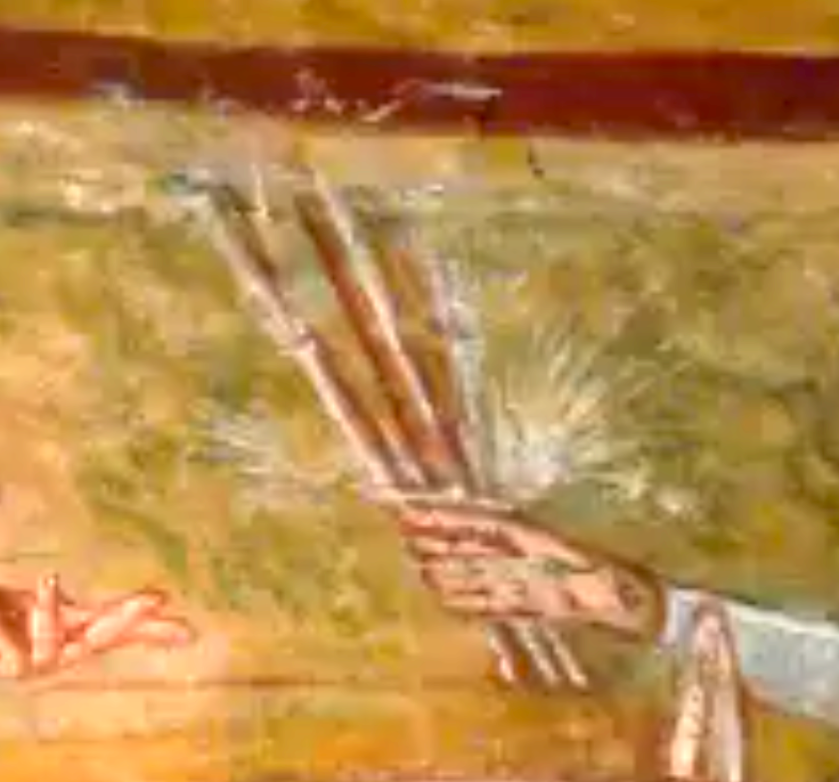 In medieval art, right-hand index finger & middle finger of God and Christ means non-branching, veiled underlying reality; eternalism; transformation from possibilism to eternalism.