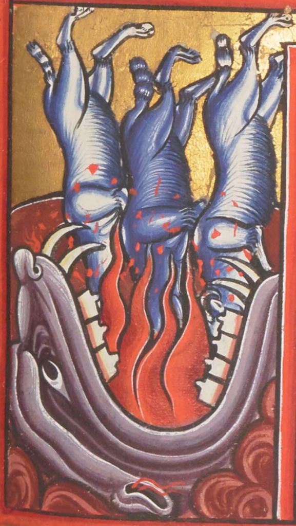 In “Eustace crossing the river”, the lion’s right (good) paw touches the branching (bad) cubensis tree.
