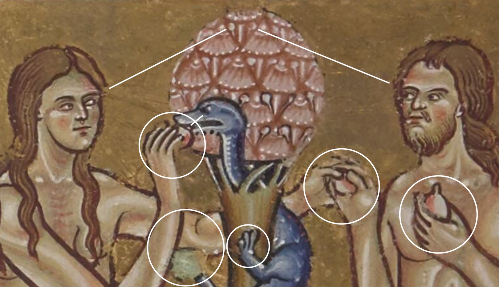 Her L hand fruit held = branching . HER R HAND FRUIT HELD AT THE SNAKE; = WORLDLINE FROZEN IN ROCK BRINGS YOU THE SACRAMENT.