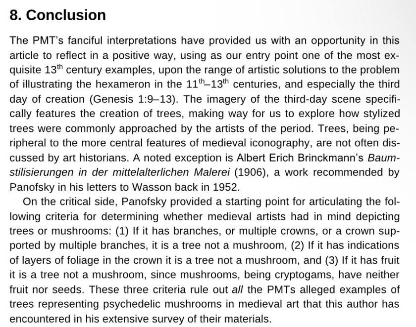 “Trees, being peripheral to the more central features of medieval iconography, are not often discussed by art historians. A noted exception is Albert Erich Brinckmann’s Baumstilisierungen in der mittelalterlichen Malerei (1906), a work recommended by Panofsky in his letters to Wasson back in 1952.”