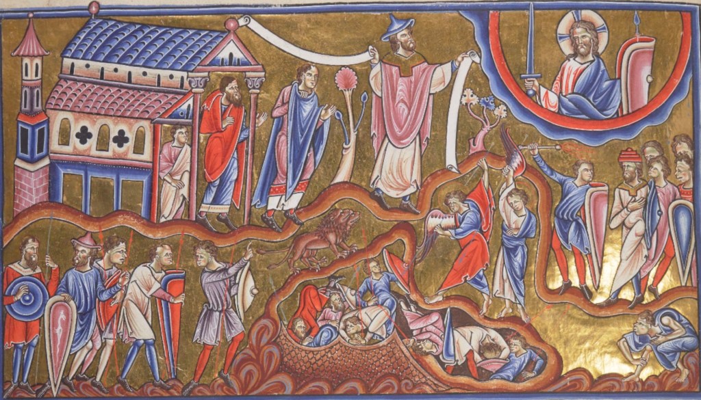 Image: Angels Harrassing Above Hellmouth, f122, Great Canterbury Psalter