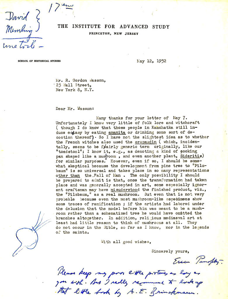 Letter of Erwin Panofsky to R. Gordon Wasson, May 2, 1952. Wasson Archives, Harvard University Herbarium, Cambridge, Mass. Tina and R. Gordon Wasson Ethnomycological Collection Archives, ecb00001, series IV, drawer W3.2, folder 20. Botany Libraries, Economic Botany Library of Oakes Ames, Harvard University.