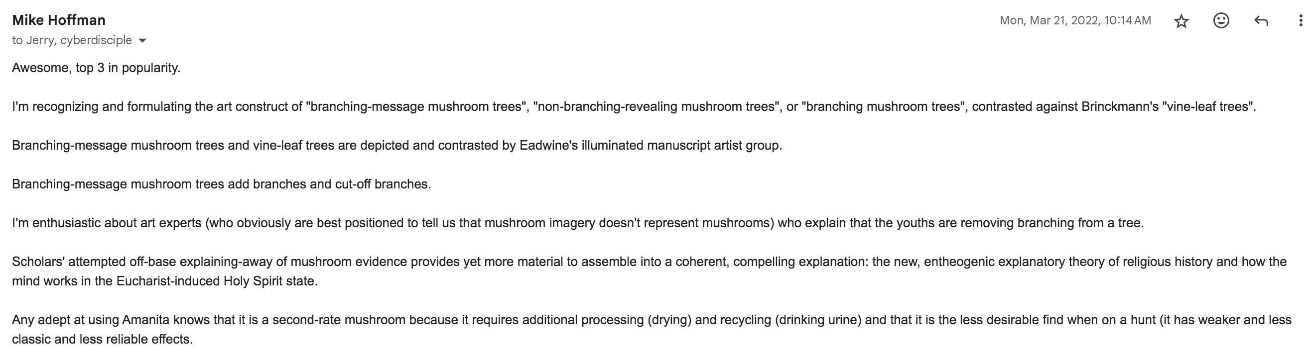 I announced in 2003 that by applying the Egodeath theory to that direction from “Mushroom-Trees” in Christian Art (Samorini 1998) to “Conjuring Eden”, I will CONTINUE that direction, instead of retreating into the Moderate (= Minimal) entheogen theory of religion.