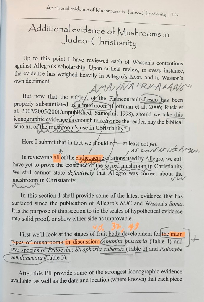 In Carl Ruck’s book Apples of Apollo, footnote 1 complains that they have to cite Allegro’s Sacred Mushroom & the Cross book in the footnote instead of the bibliography, because if they were to put Allegro’ book in the bibliography, it would be the first book listed, and that’s not acceptable.
