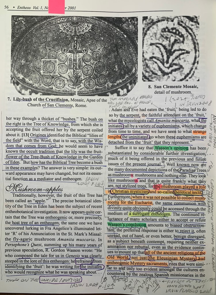 p. 56 of “Daturas for the Virgin”, Ruck et al, Entheos 2, 2001: “Wasson’s conclusion” Placed After Wasson’s Genesis Text Proposal and then “substantiated by many depictions of the Paradise Trees as mushrooms”