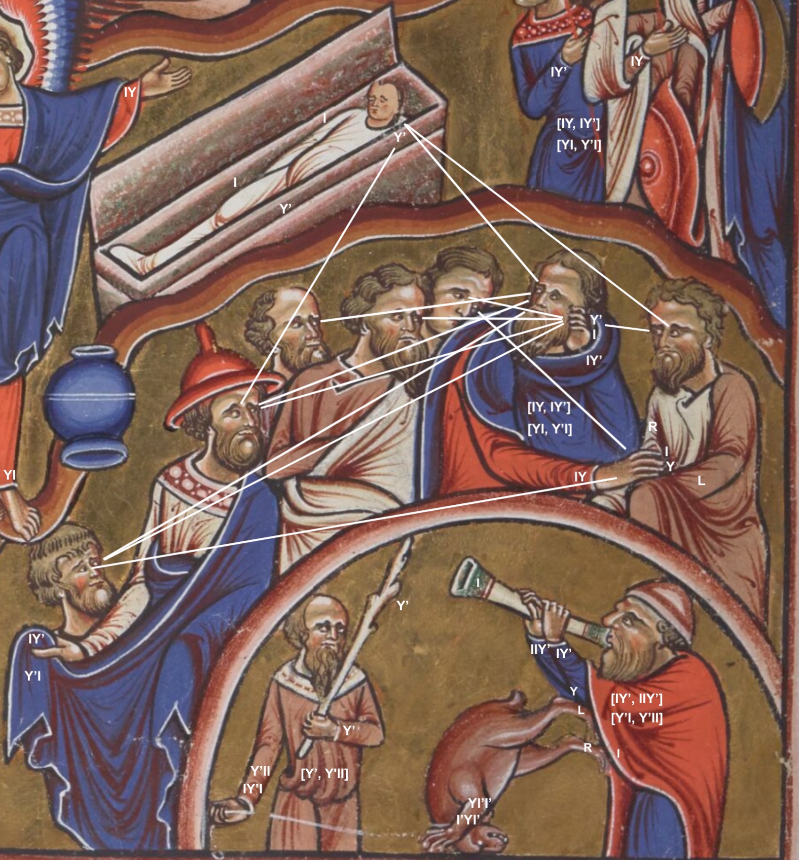 Her Left hand forms a powerful Y’III, like the Right and debatably the Left hand of Mushroom King, Great Canterbury Psalter folio image f145 row 2 Right.