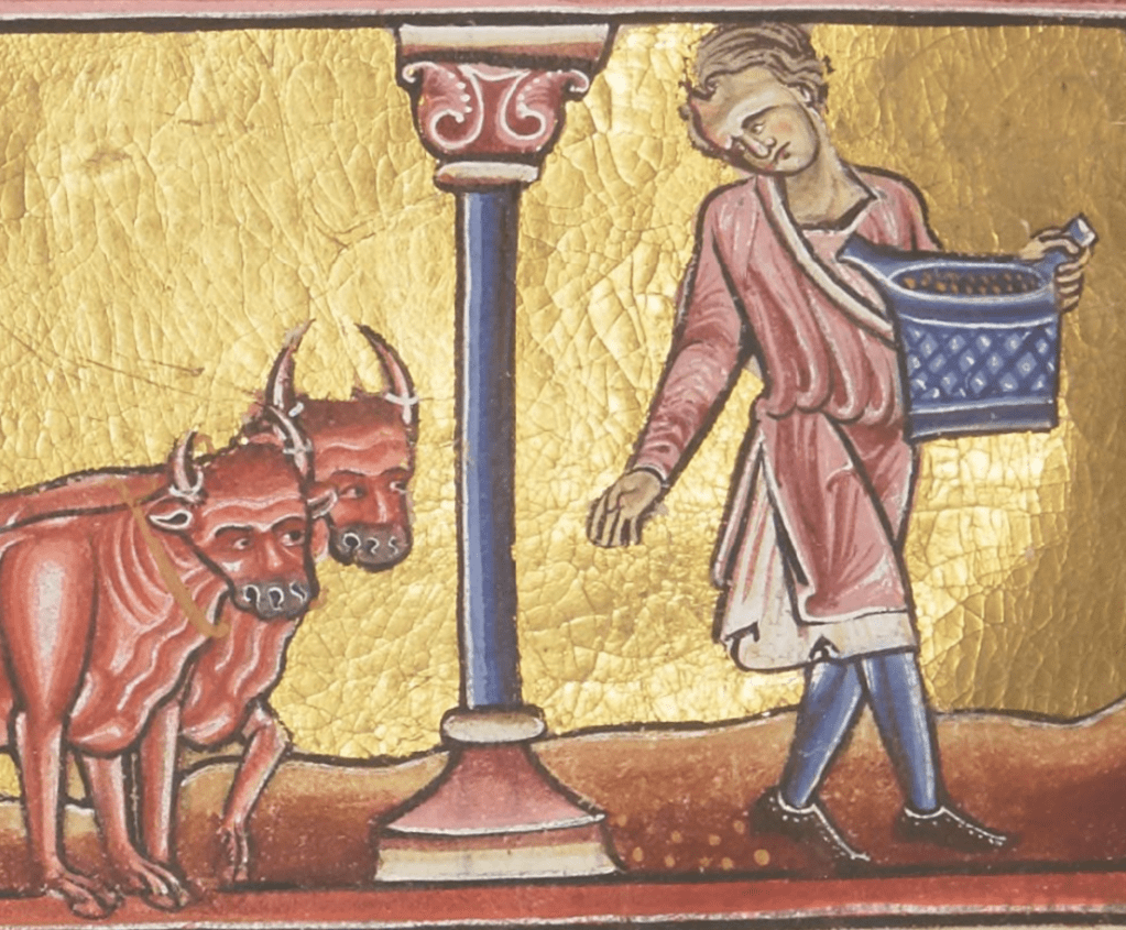 The sower’s left hand is secured on the cut-off branch of the grain-container, and his right hand floats (that’s backwards).